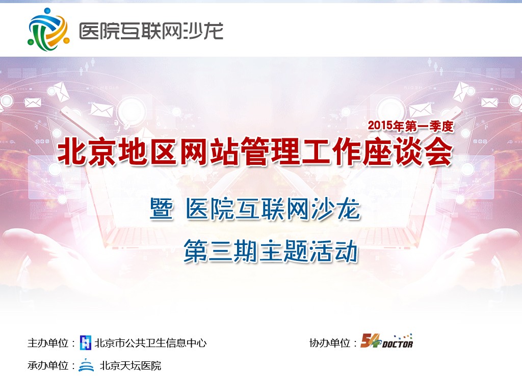 各相关单位: 为了促进北京地区网站管理工作顺利开展,加强网站管理工作者的交流,北京市公共卫生信息中心将召开2015年季度北京地区网站管理工作座谈会,主要交流和讨论在互联网医疗大背景下2015年各家单位网站工作的计划和思路。请相关人员准时参加会议并就本单位相关工作进行交流。 会议时间:2015年4月10日(周五)下午13:30 …